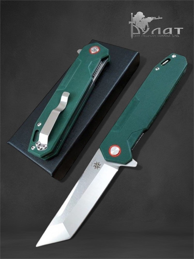 Рукоять прямоугольной формы, собрана на интегрированных стальных лайнерах, соединенных осевым узлом и двумя бонками. Накладки из зеленого стеклотекстолита G10 с рифленой структурой. G10 – очень прочный, устойчивый к нагрузкам и агрессивным средам материал, который практически не изнашивается и не выгорает, не боится воды.