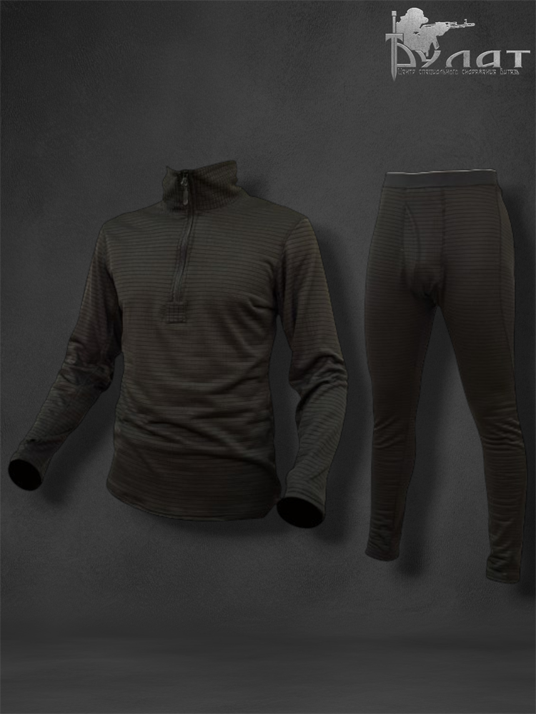 Комплект нательного белья состоит из фуфайки и кальсон. Фуфайка с длинным рукавом. Воротник-стойка. Би компонентная структура полиэфирных волокон позволяет быстро отводить влагу от тела, равномерно распределять по поверхности полотна и быстро сохнуть.