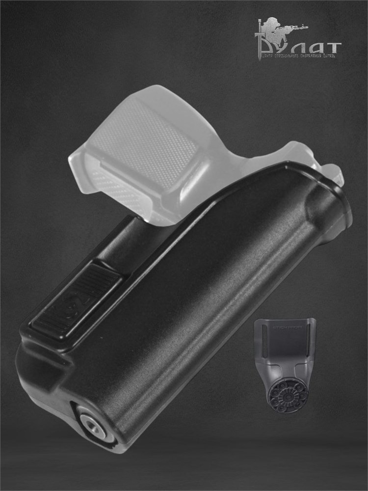 Крепление кобуры является выносным и рассчитано на ремень до 50 миллиметров, и позволяет регулировать угол наклона в произвольном положении. Подходит для использования с объемным обмундированием, бронежилетом, бушлатом и т.п.