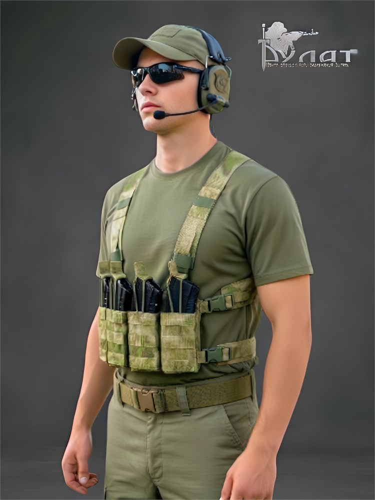 Лёгкий и компактный нагрудник представляет собой панель с четырьмя, пришитыми на переднюю панель, подсумками с фиксацией магазинов эластичным шнуром.