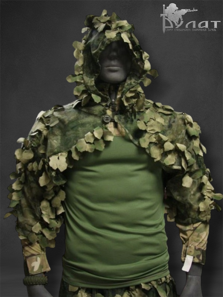 - нашитые индивидуальные маскировочные элементы в виде листьев, разбивающие и размывающие контуры и силуэт;