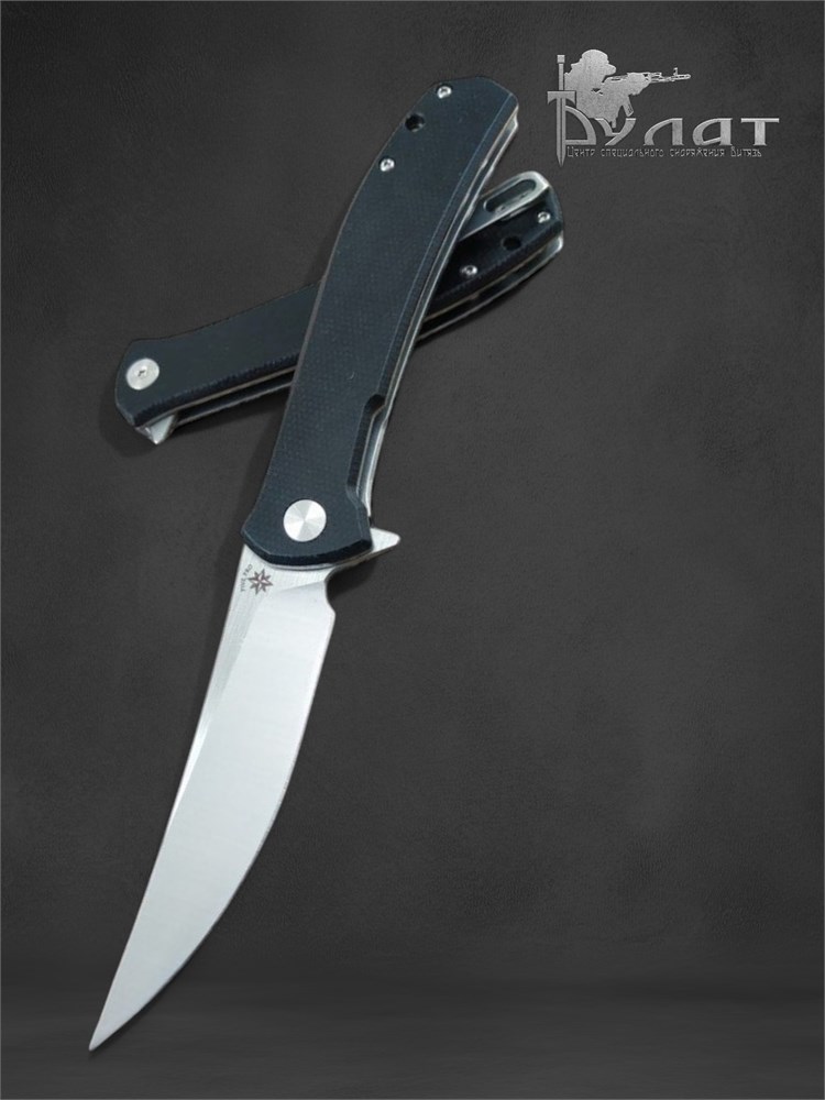 Клинок с обухом толщиной 3,3 мм, профиль с приподнятым острием – Trailing-Point. Спуски прямые почти от обуха, финишная обработка – сатинирование (satin). Сталь – инструментальная углеродистая D2 твердостью 58-60 HRC. Благодаря форме клинка у ножа увеличенная протяженность режущей кромки, что в сочетании с высокими спусками и углеродистой сталью обеспечивают хороший рез. Острие клинка острое, как игла, нож имеет высокую пробивную способность.