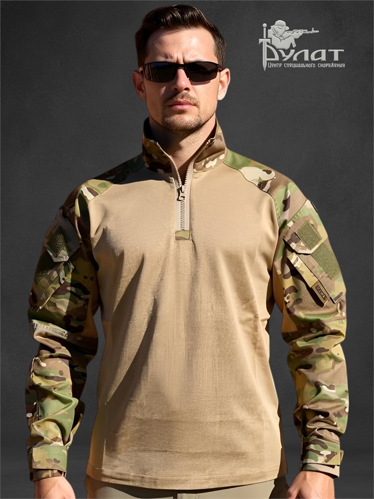 Основа рубашки 100% хб, верх рубашки ткань рип-стоп 65% п/э, 35% хлопок. Воротник на застежке типа «молния», рукава снабжены возможностью встроить съемнымный налокотник и карманами с нашитыми велкро панелями. Манжеты рубахи также регулируются с помощью велкро.